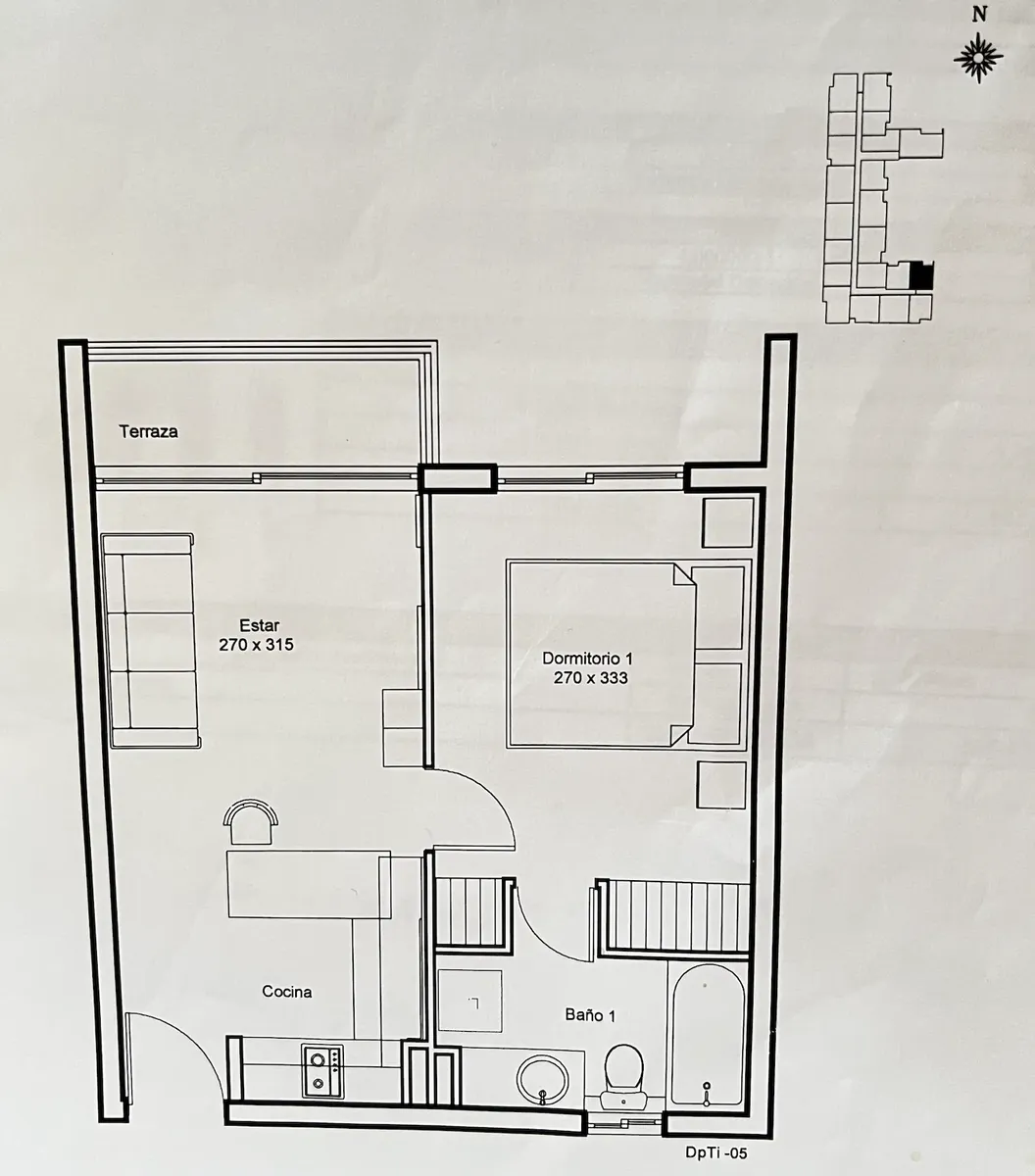 Este luminoso departamento cuenta con una vista norte despejada, garantizando luz natural durante todo el día. El dormitorio en suite incluye un baño completo y un clóset funcional.
