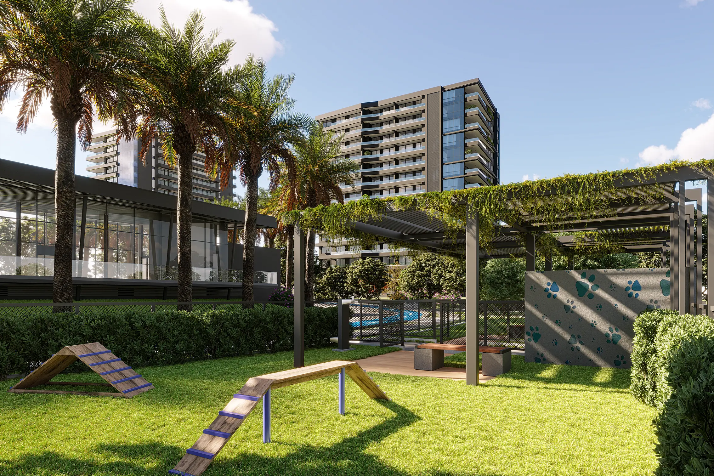 Piscina semiolímpica de dos carriles de nado con diferentes espacios y mobiliario diseñados para relajación, descanso y recreación.