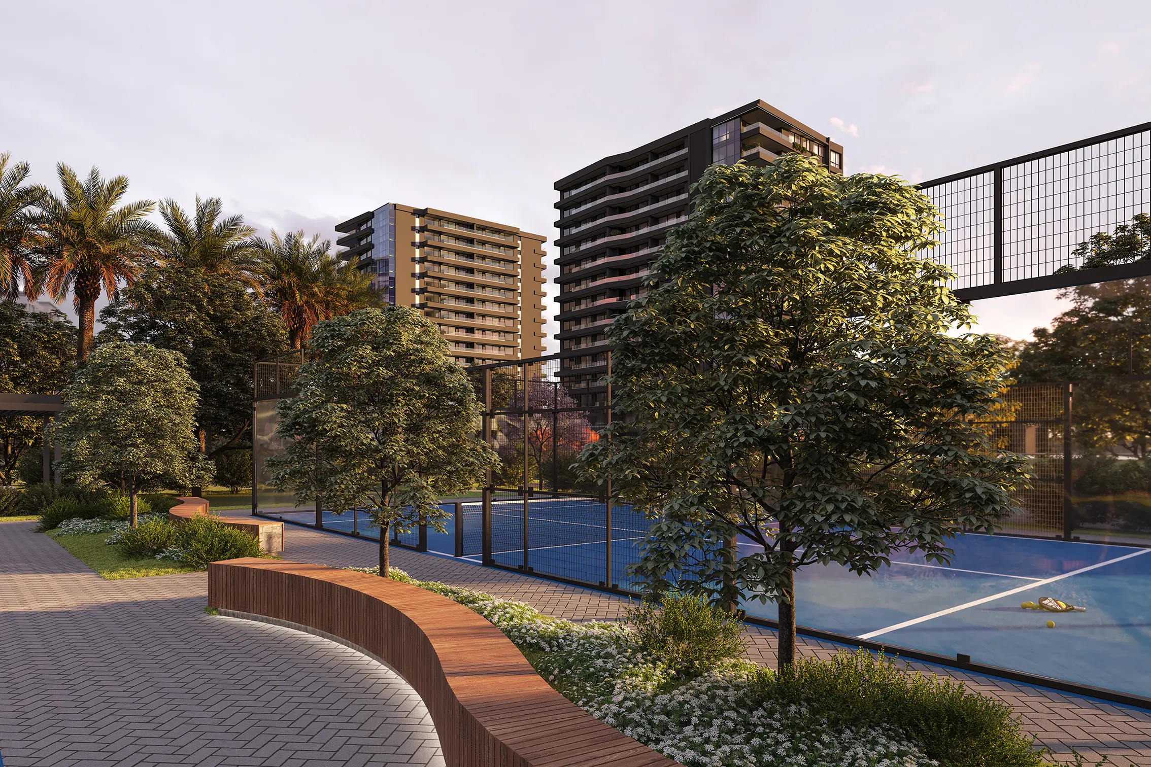 Proyecto de paisajismo con áreas de descanso, contempla uso de especies de bajo recurso hídrico y más del 50% de especies nativas.